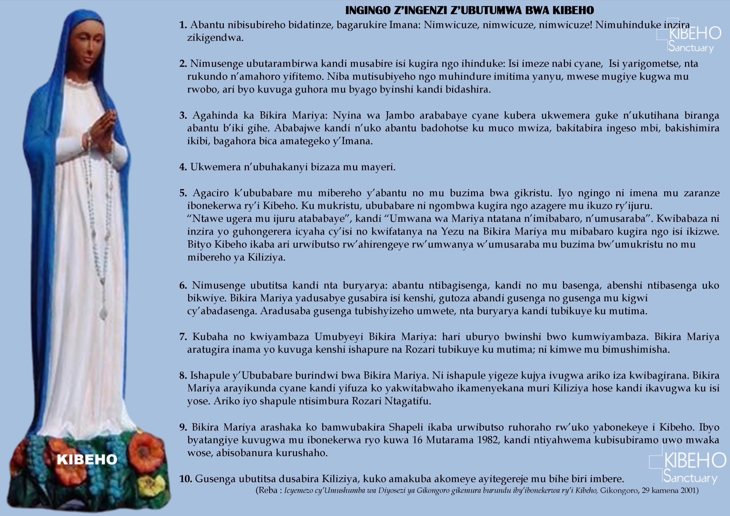 INGINGO Z’INGENZI Z’UBUTUMWA BWA KIBEHO Abantu nibisubireho bidatinze, bagarukire Imana: Nimwicuze, nimwicuze, nimwicuze! Nimuhinduke inzira zikigendwa. Nimusenge ubutarambirwa kandi musabire isi kugira ngo ihinduke: Isi imeze nabi cyane, Isi yarigometse, nta rukundo n’amahoro yifitemo. Niba mutisubiyeho ngo muhindure imitima yanyu,
